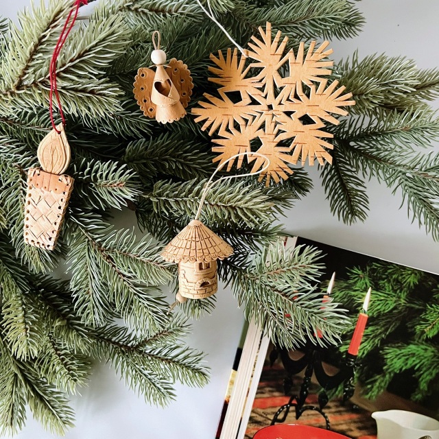天然の白樺樹皮の風合いがそのまま残っており、シンプルながらぬくもり溢れるオーナメントとなっています。