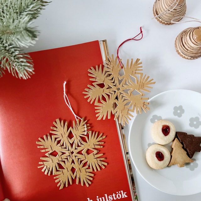 白樺の樹皮を、雪の結晶のような形にカットしたオーナメント。
