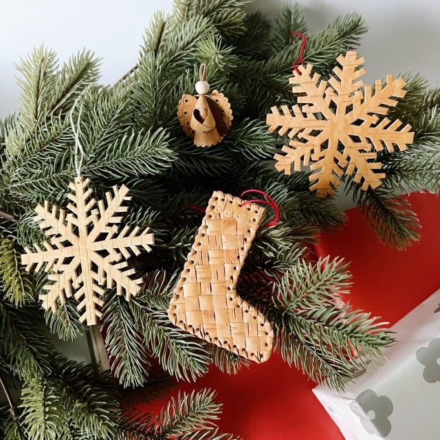 天然の白樺樹皮の風合いがそのまま残っており、シンプルながらぬくもり溢れるオーナメントとなっています。