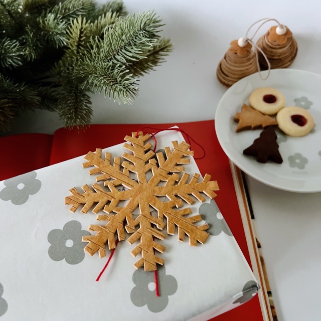 白樺の樹皮を、雪の結晶のような形にカットしたオーナメント。