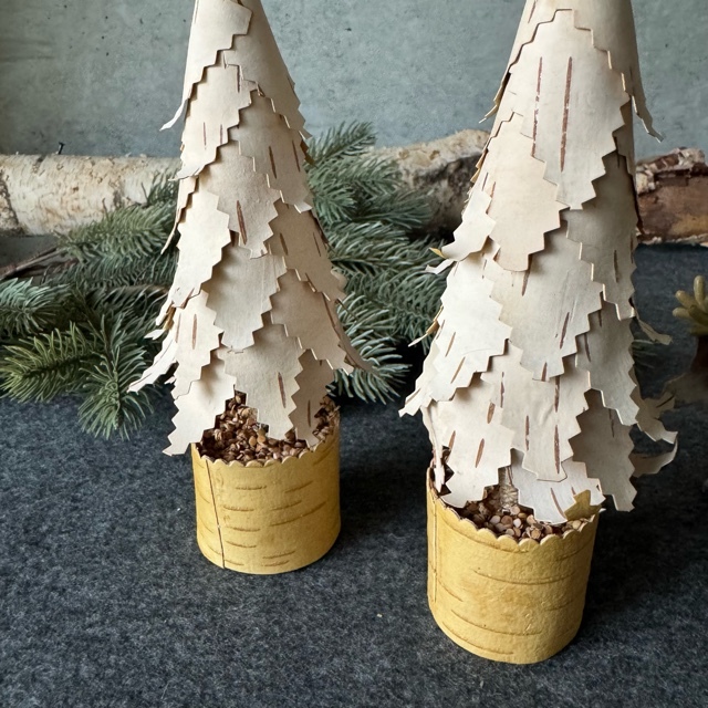 白樺樹皮の白っぽい面を使って作られた、クリスマスツリーです。