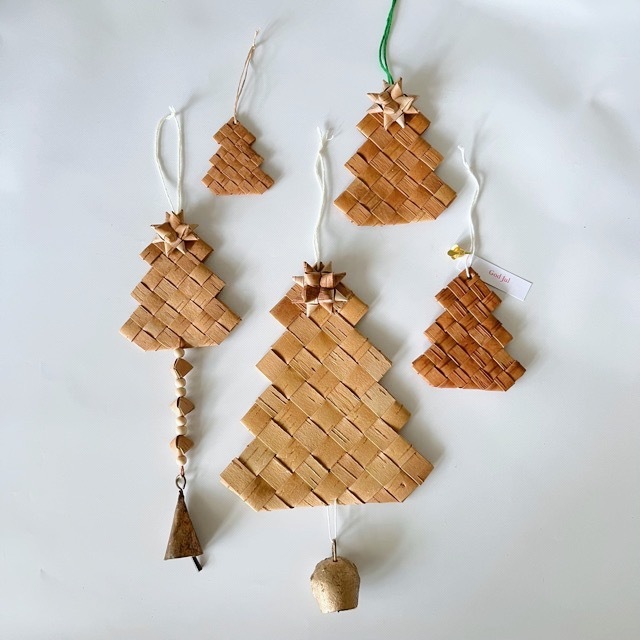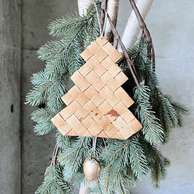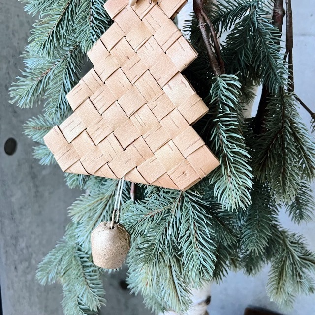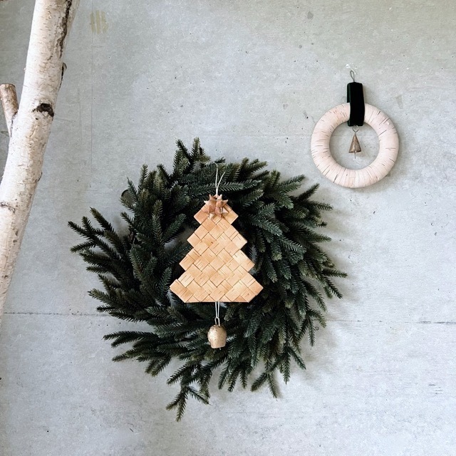 トップに、白樺の星がついた、ベル付きのクリスマスツリーの壁飾り。