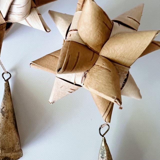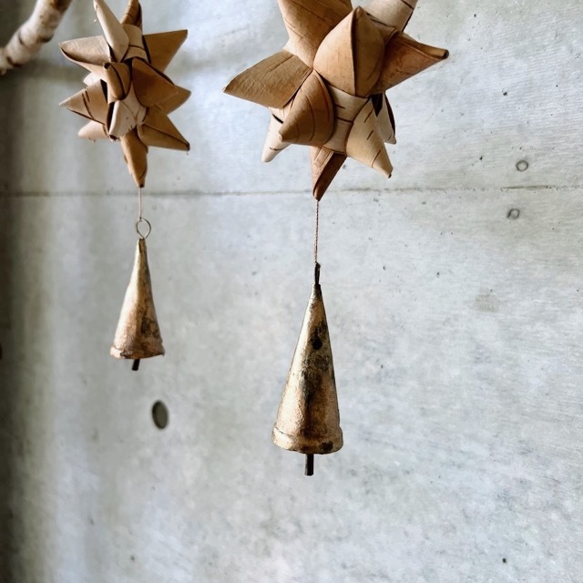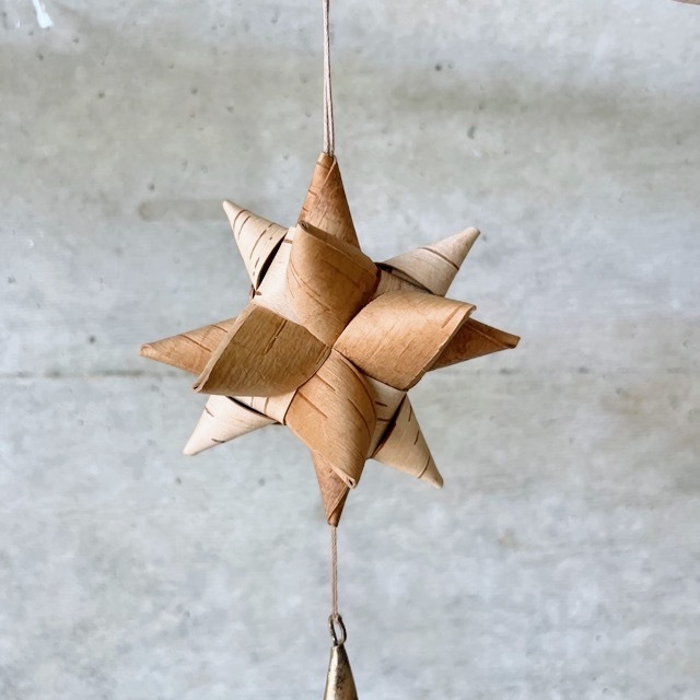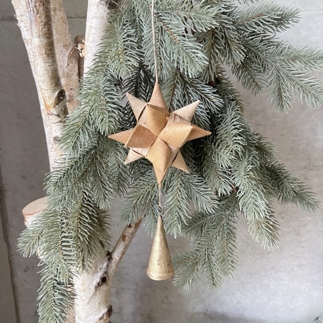 白樺で立体的に編まれた星に、金属製のベルをあしらったオーナメントです。
