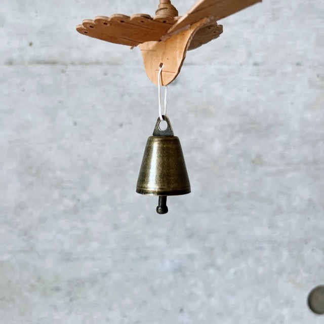 白樺でかたどった愛らしい小鳥や小さなパーツに、金属製のベルを添えたオーナメントです。