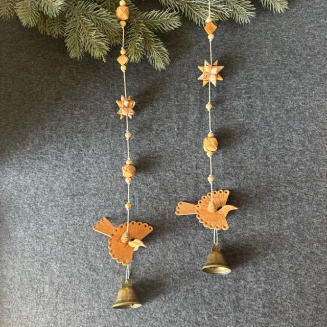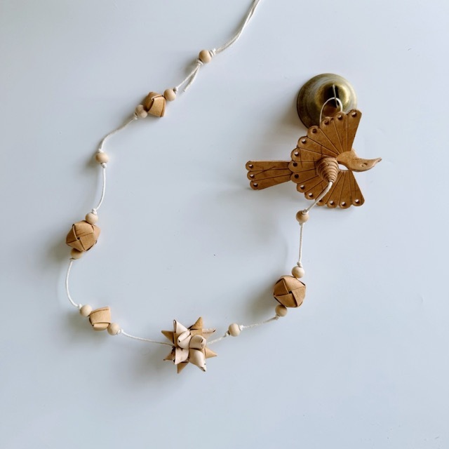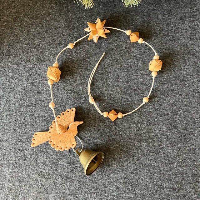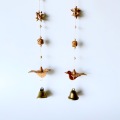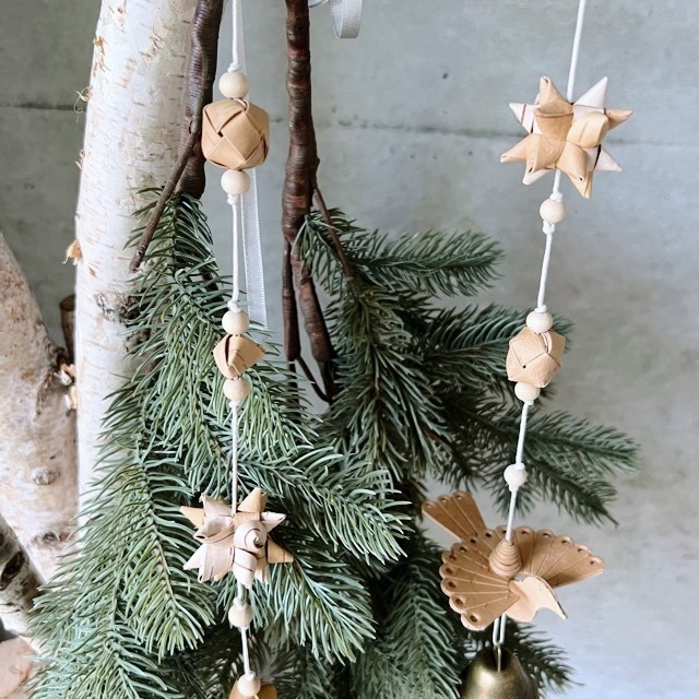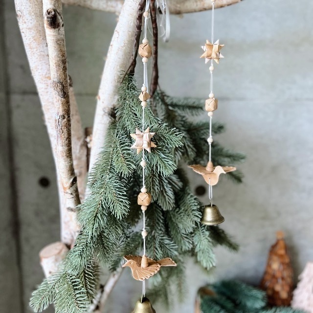 白樺でかたどった愛らしい小鳥や小さなパーツに、金属製のベルを添えたロングガーランドです。