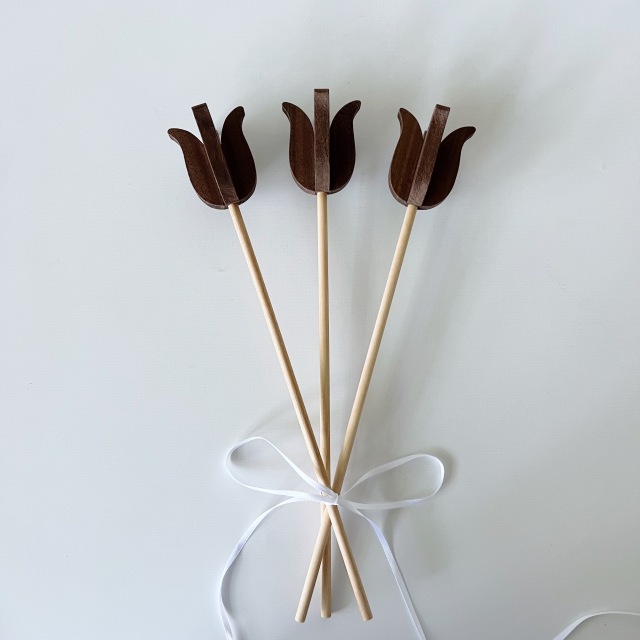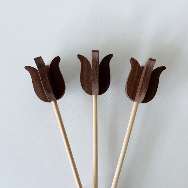 こちらは、小サイズ、こげ茶色で落ち着いた印象のウォールナット材のチューリップとなります。